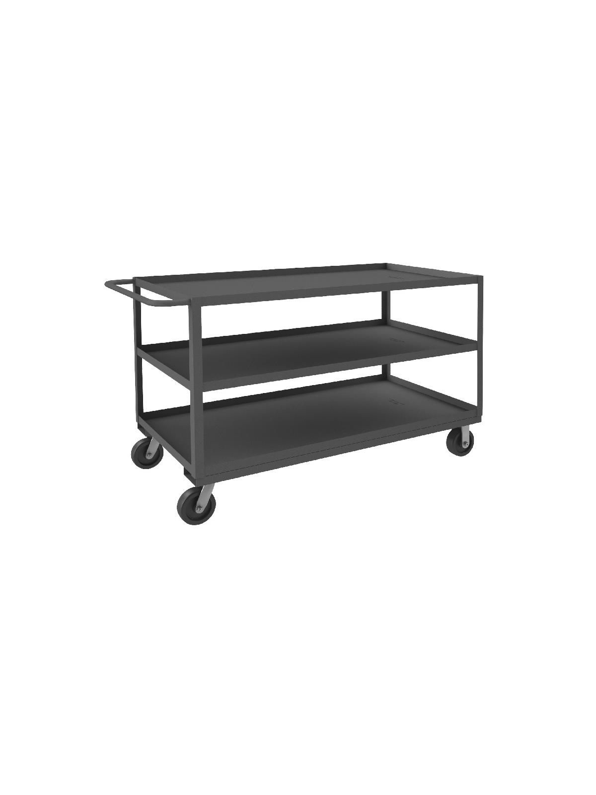 Shelf carts are constructed with 1-1/2" x 1/8" angle iron uprights for added strength. Heavy duty 14 gauge steel shelves. Sturdy tubular push handle. Perfect for transporting heavier parts or stock items. Shelf Stock Carts are available in 1,200 lbs. or 3,000 lbs. capacities. FOB Shipping Point.