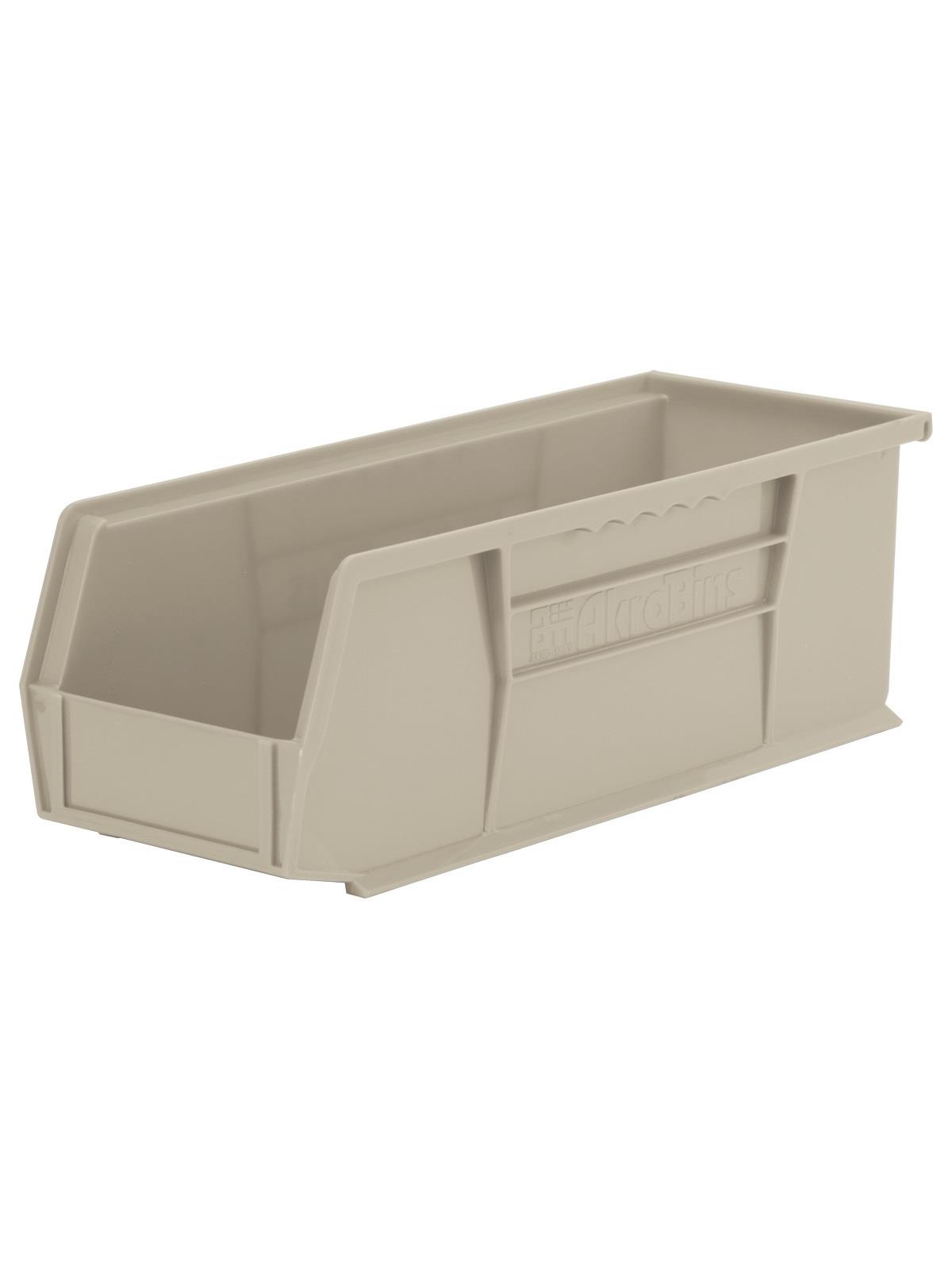 AkroBins are heavy-duty and securely stack on top of each other, sit on shelving, and hang from Akro-Mils racks, panels, rails and carts. Unaffected by weak acids and alkalis the sturdy one piece construction is water, rust and corrosion-proof. Finger grip allows for easy handling. Large label slot for easy identification of contents. Autoclavable up to 250° F. Guaranteed not to crack or break under normal load conditions as stated in the 1-year limited warranty. Optional dividers and labels available, see Related Items tab. AkroBins available in Red, Yellow, Blue, Green, Black, Stone, and Semi-Clear. FOB Shipping Point.