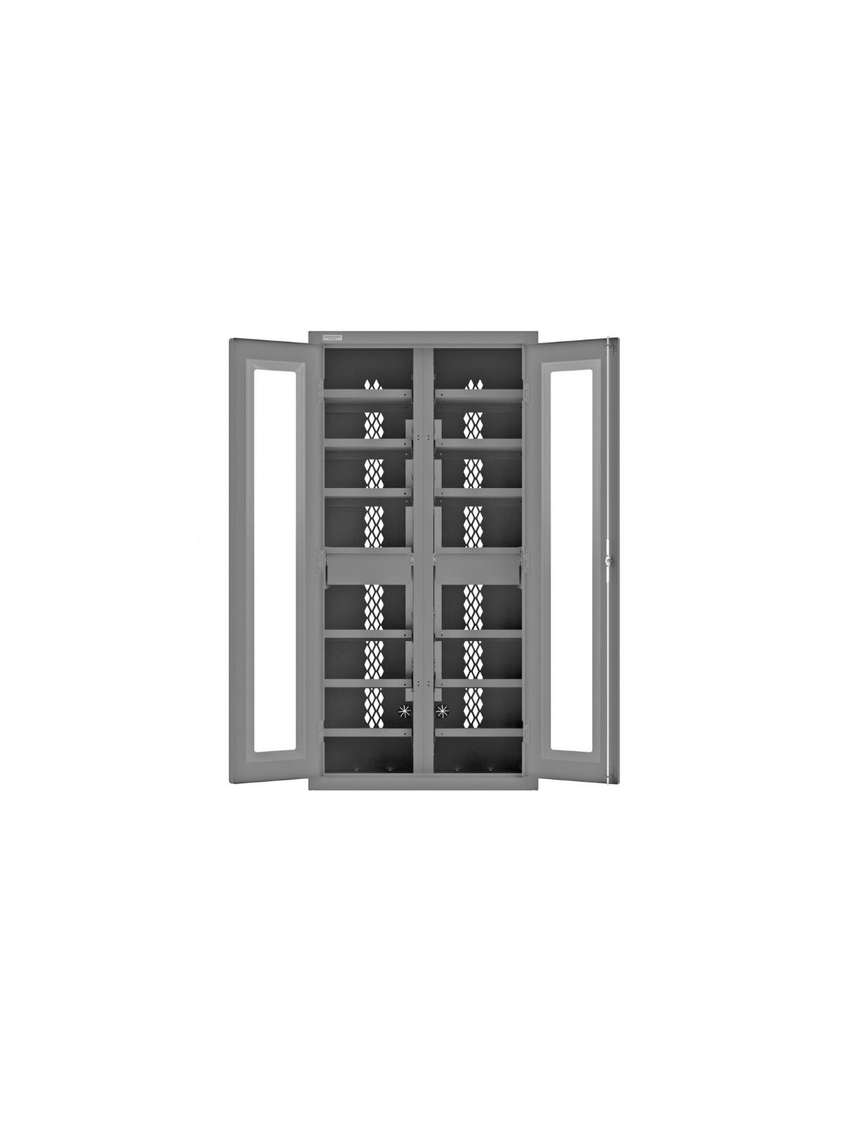 • (6) shelves lips up to contain items; (6) lips down for flat, stackable storage-offering versatile organization.