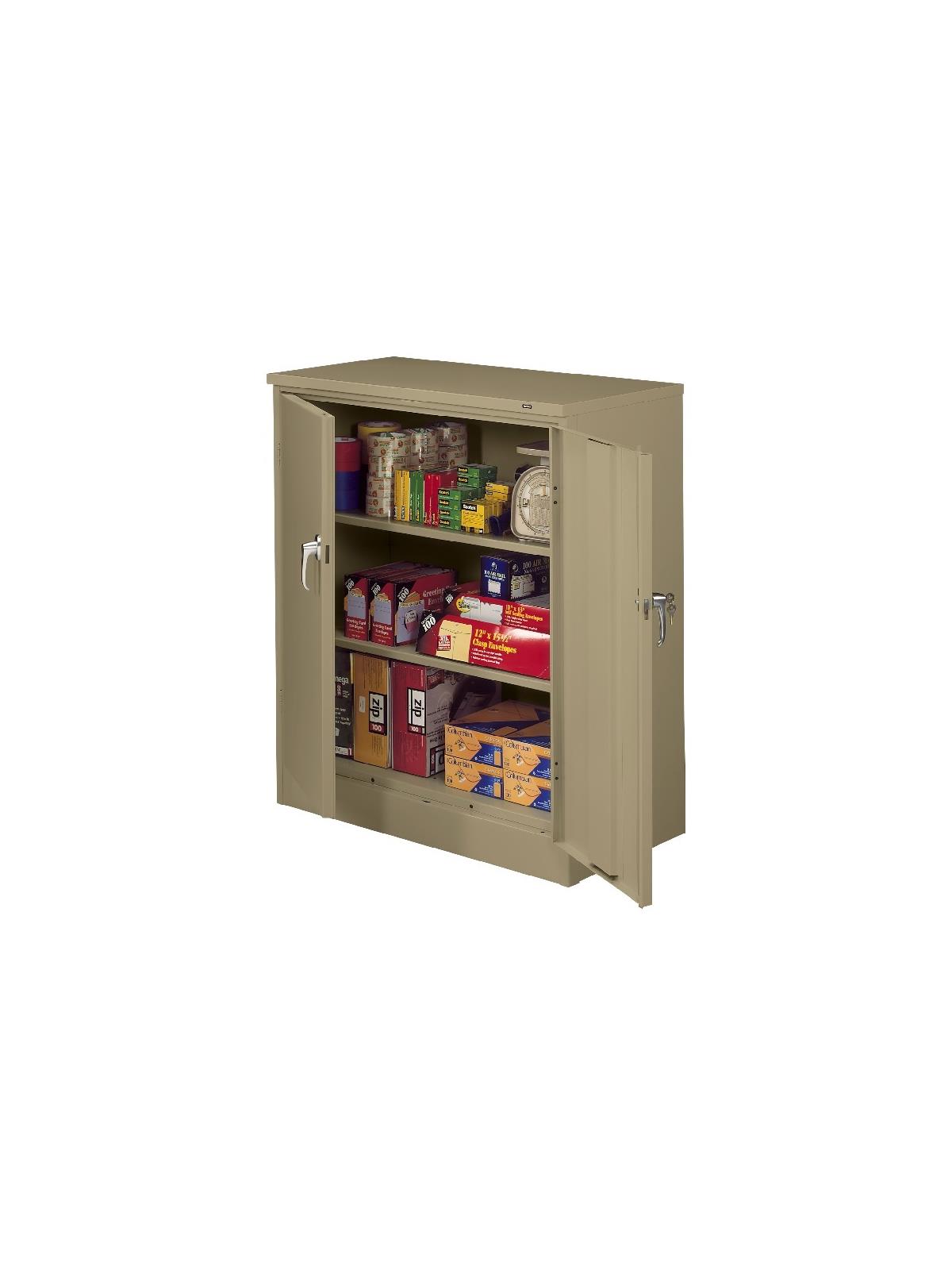 Knuckle hinges on each door insure the integrity of the cabinet and the alignment of the doors. Doors are reinforced for strength and quietness. Handle on right-hand door activates a 3-point system for added security; dummy handle on left-hand door. Shelves are adjustable in 2" increments on built-in shelf tabs. Shelves will hold up to 200 lbs. evenly distributed. Two front leveling glides compensate for uneven floors. Louvered back panel allows air circulation in the cabinet. Available in four models--storage, wardrobe, combination, and counter high cabinets. Available in Black, Champagne/Putty, Sand, Light Gray and Medium Gray. FOB Shipping Point.